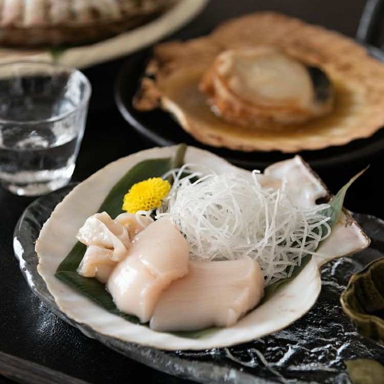 片方に日本酒のビン、もう片方に泳ぐホタテなどをお入れします。