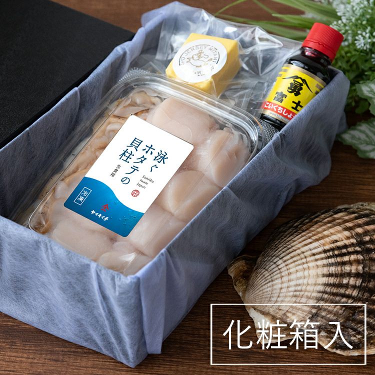 冷蔵パックはお届け日にあわせてご用意します。届いた時にもむきたてのシャキシャキ感を味わっていただけますので、お刺身や海鮮丼として生のままお召し上がりいただくのがおすすめです。