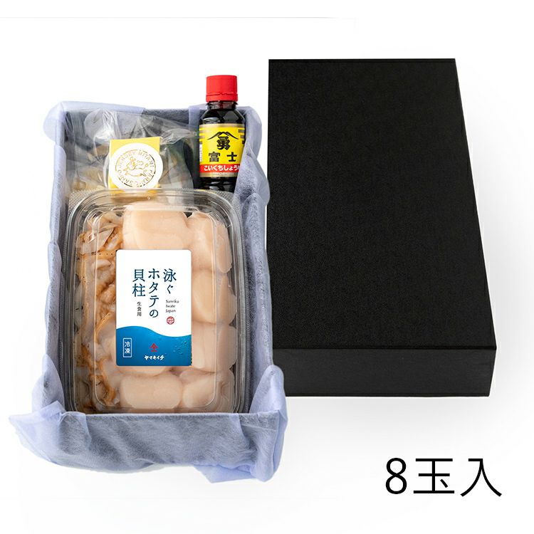大粒の貝柱8玉と貝ヒモ8本をセットにしたパックです。貝柱だけでなくヒモのコリコリした食感やホタテの本来の美味しさを堪能したい方におすすめです。これだけ新鮮な貝ヒモを提供できるのはヤマキイチならではです。ギフト用におすすめしたい逸品です。