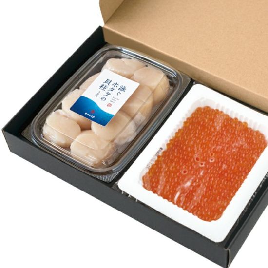 シャキシャキの剥きたてホタテ貝柱と、特上いくらのセット。お祝いやご贈答にどうぞ。