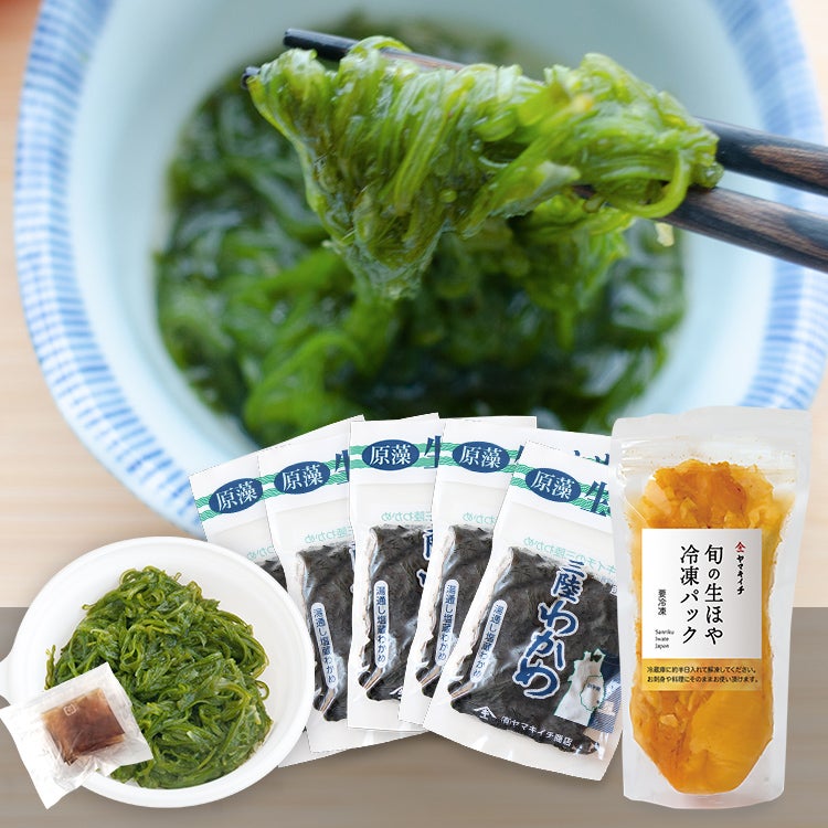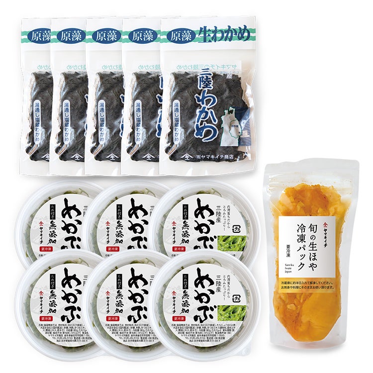 他の画像を見る NEW 冷凍 クール便でお届け わかめ・めかぶ・冷凍ほやセット (塩蔵わかめ50g×5袋・冷凍めかぶ80g×6、冷凍ほや×1袋) 販売価格 ¥ 4,134 税込 わかめ小袋サイズとめかぶの1食分パック、冷凍ほやの組み合わせ。旬の恵み詰め合わせです。 カートに入れる お気に入りに登録する