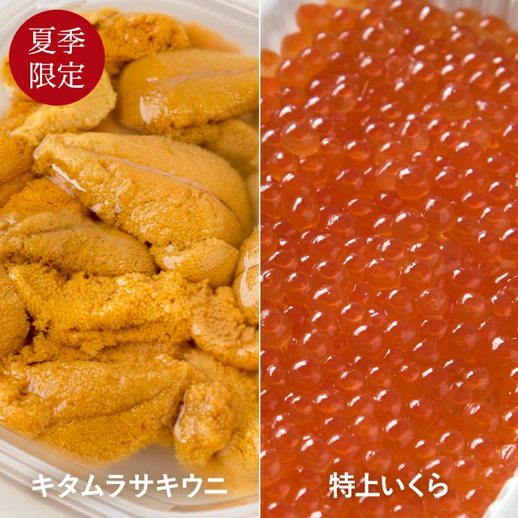 他の画像を見る 期間限定 配達日指定不可 冷蔵 クール便でお届け 夏に旬を迎えるうにと、「特上いくら」を豪華セットにしました。いくら&うに丼などでお楽しみください! うに&いくらセット(各150g)(期間限定) 販売価格 ¥ 9,288 税込 〜 販売価格 ¥ 税込 夏に旬を迎えるうにと「特上いくら」の彩りもあざやかなセット。丼にして目安はたっぷり2〜3人前です。 在庫なし 販売を終了しました。 詳細を見る お気に入りに登録する